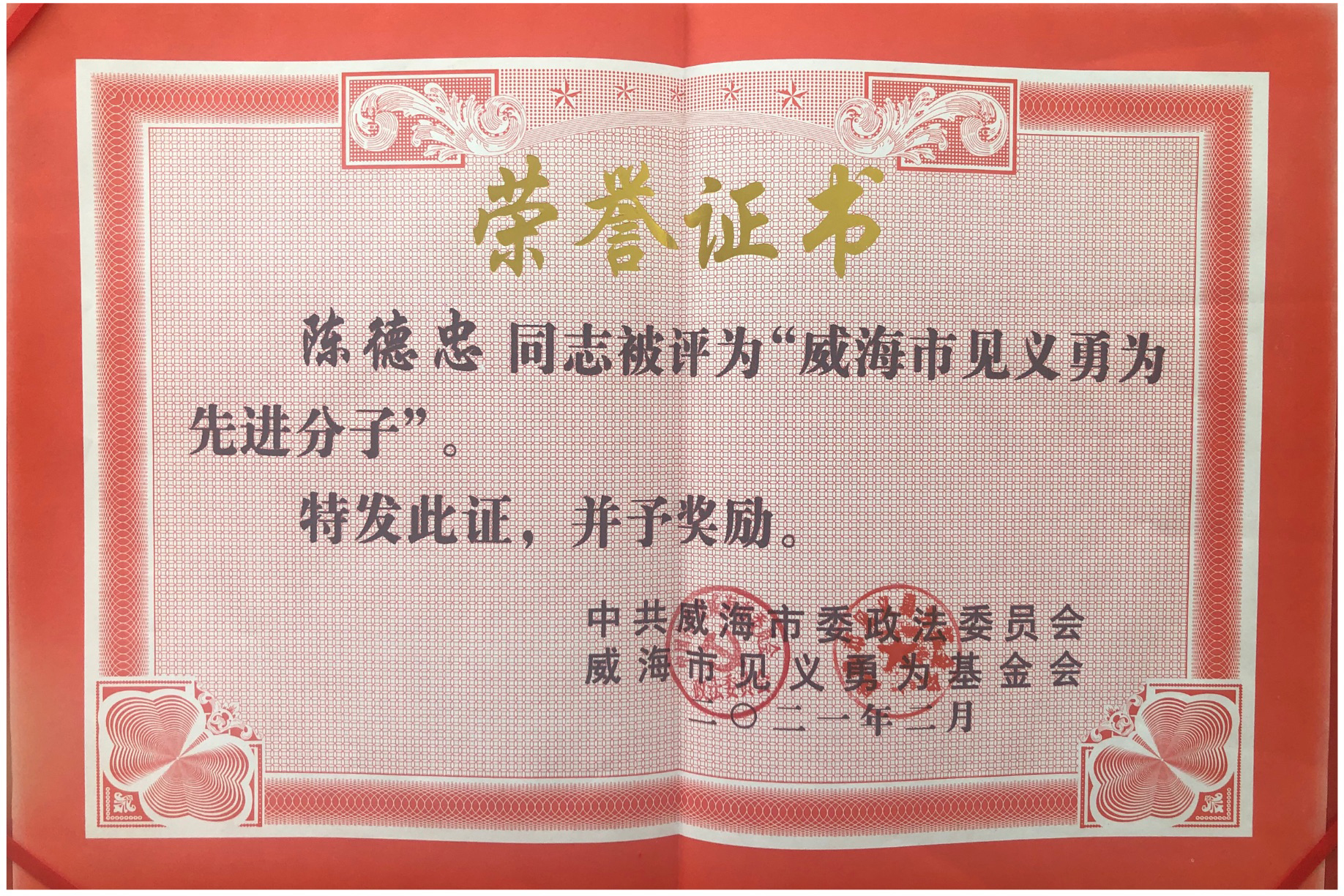 市水務集團羊亭轄區(qū)保安陳德忠被授予“威海市見義勇為先進分子”榮譽稱號